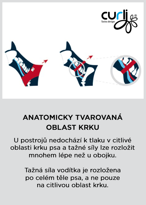 - anatomicky tvarovaná oblast krku – nedochází tak k tlaku na citlivou oblast krku psa a tlaková síla vodítka se tak rozloží na celé tělo psa